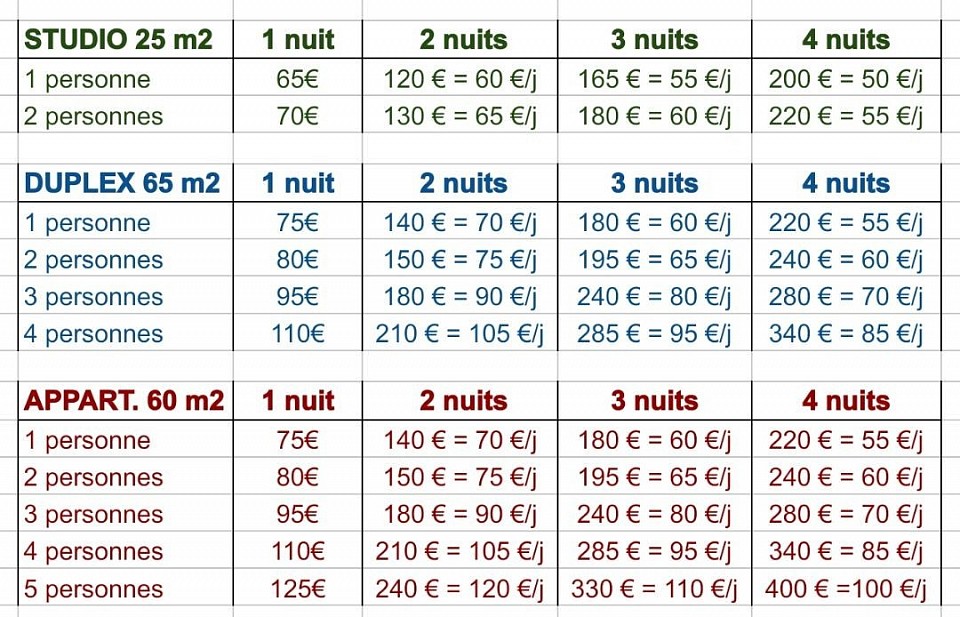 - Le DUPLEX, pour 4 personnes et 2 nuits le total est de 210€.